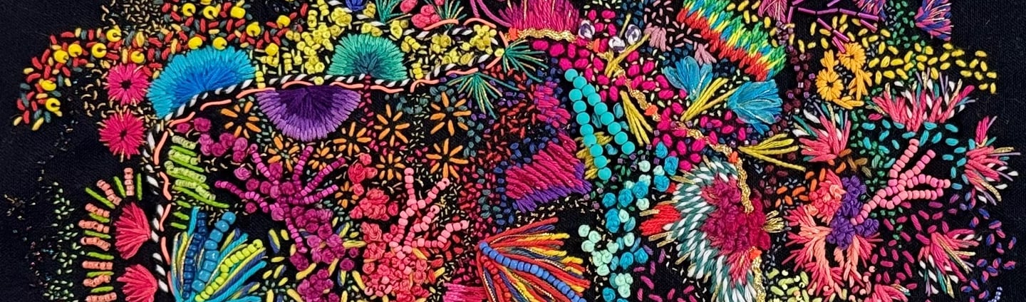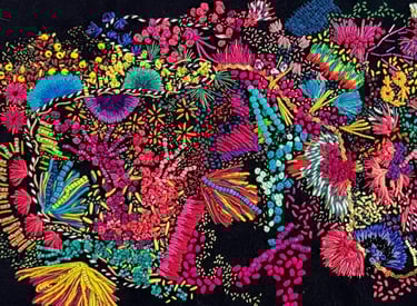 Mi trabajo textil nace del tiempo lento: la escucha paciente del color, la intuición del gesto y la constancia del hilo que avanza sin prisa. Bordo para comprender lo que el ojo no siempre alcanza, los ritmos internos, las memorias que persisten y las capas que la vida deposita sin que lo notemos.