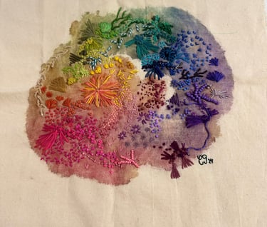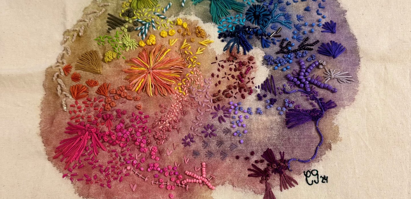 Bordado a mano sobre manta natural intervenida con tintes y acuarelas. La obra explora la transición entre distintos gestos cromáticos y táctiles, revelando el punto exacto en el que una forma comienza a transformarse en otra.